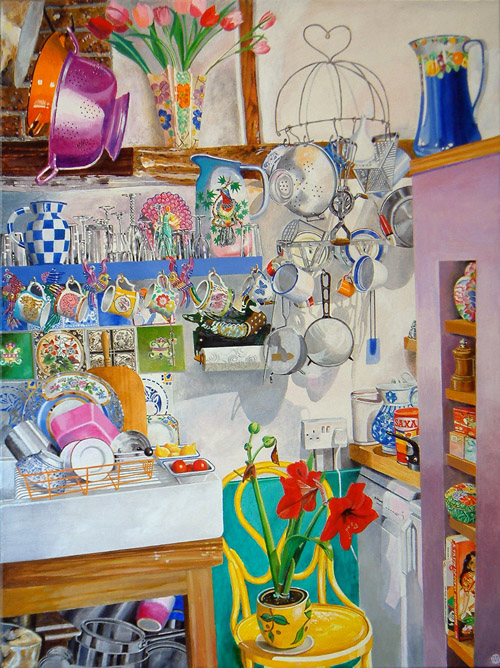 How many writers does it take to change a light bulb? Well ideally one: I’d prefer to describe the experience on a purely theoretical level, while someone else does the actual research. Jon Wealleans feels the same as I do, although as a hyper-realist painter he doesn’t have the option of reducing complex manipulations to the mere pecking of plastic keys; instead, in his new series of pictures, Kitchen Kitsch, he has chosen to embrace the perverse clarity of the contemporary cluttered kitchen.
